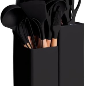 Utensílios para Cozinha de Silicone, Kit com 19 Peças – Cabo de Madeira, Conjunto Completo com Espátula, Concha, Colher, Faca, Tábua, Tesoura e Suporte, Antiaderente, Jogo Utensílios preto